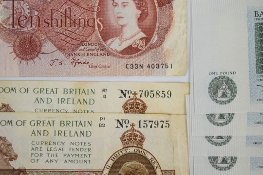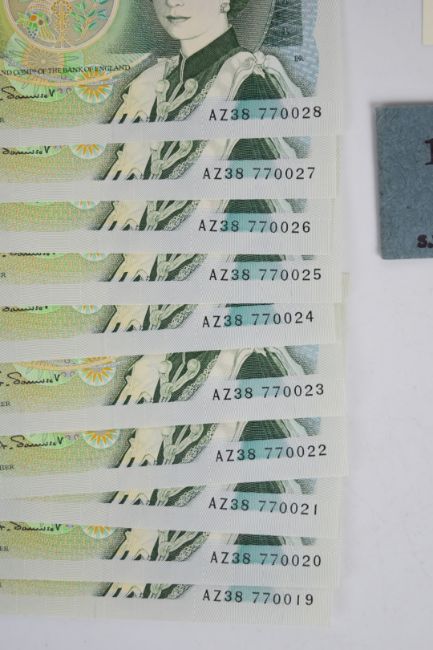 Bank Of England banknotes to include 2 x Norman Fenwick Warren Fisher green & brown £1 examples, 6 x L.K.O'Brien green £1 notes, a P.S.Beale £1, a further Queen's Portrait O'Brien, 2 x J.B Page £1 notes, 10 x crisp uncirculated D.H.Somerset consecutive examples in Barclays sleeve, and a further x 2 including a consecutive pair,together with a crisp uncirculated later J.B.Page, a J.S.Forde 10 shilling note together with two crisp uncirculated Canadian dollar notes with consecutive numbers