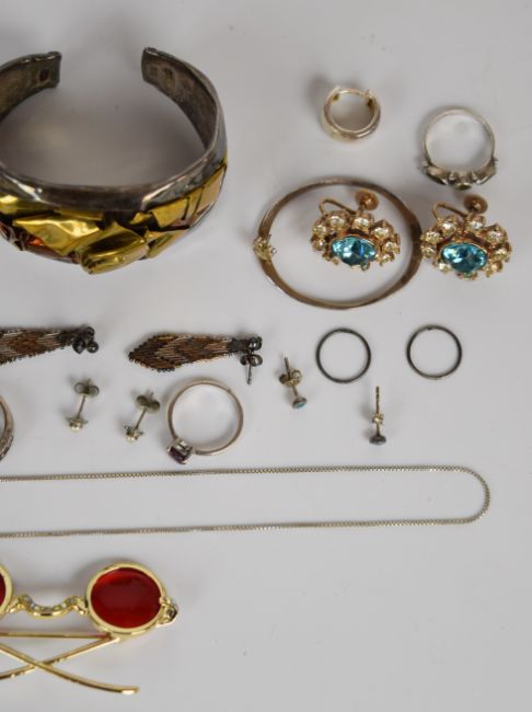 A collection of silver jewellery including six pairs of earrings, brooch, four rings, chain and crucifix, together with a Hollycraft brooch and Veina bangle