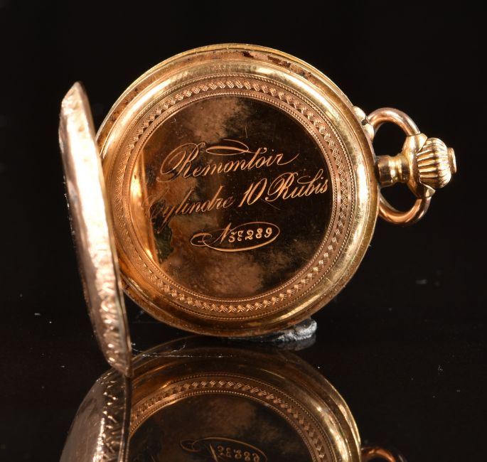 Unnamed 18ct gold keyless winding full hunter pocket watch with guilloché enamel religious scene and rose cut diamonds set to the case, ornate gold hands, black Roman numerals, white enamel dial and unsigned 10 jewel movement, case diameter 29mm, serial number 37289, 23g.