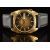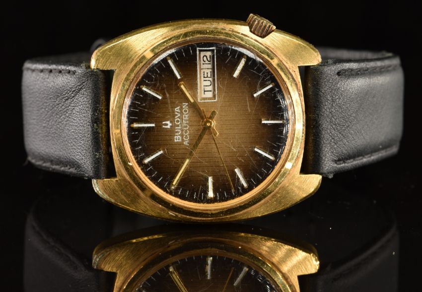 Bulova Accutron gentleman's wristwatch with day and date aperture, luminous hands, baton hour markers, graduated 'smoke' dial, gold plated case and 'tuning fork' movement, on black leather strap, case diameter 36mm, serial number 3-713882.