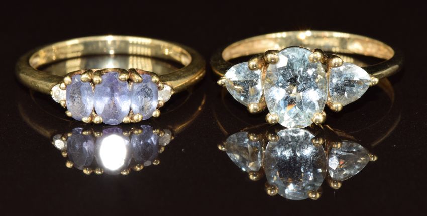 Two 9ct gold rings, one set with tanzanites and diamonds and the other topaz, 4.6g, size S & P