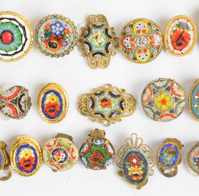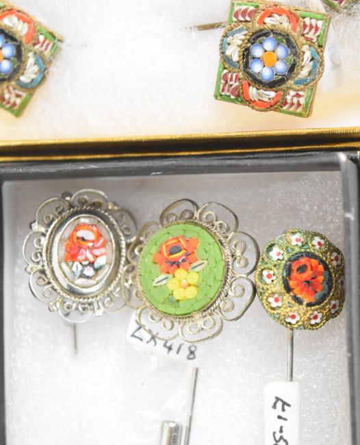Twenty-one micro mosaic stick pins and nineteen pairs of micro mosaic earrings