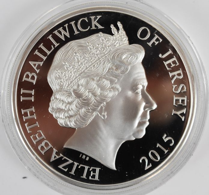 Two cased Bailiwick of Jersey and Guernsey 925/1000 proof 5oz silver coins, one with certificate