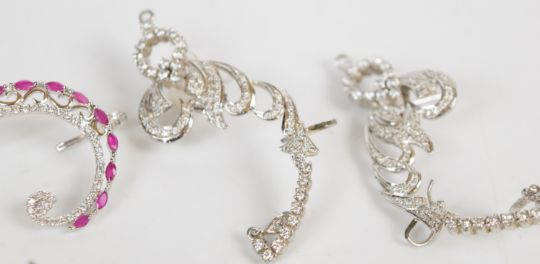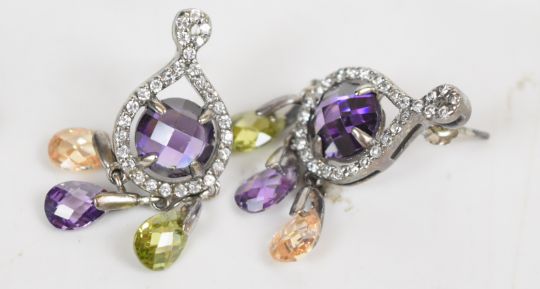 Five pairs of silver earrings set with rubies, cubic zirconia, topaz, citrine, etc, 48g