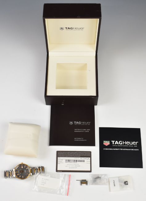 Tag Heuer Carrera gentleman's automatic wristwatch ref. WAR215E-2 with date aperture, luminous copper hands and hour markers, grey dial, gold bezel, stainless steel case, clear exhibition case back and signed Calibre 5 movement, on bi-metal bracelet, case diameter 39mm, serial number RZC7831, in original box with spare bracelet links, guarantee card and instructions.