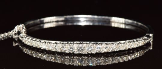 An 18ct white gold bangle set with graduating round cut diamonds, the largest approximately 0.15ct, Birmingham 1994, 16.9g, 4.8 x 5.4cm