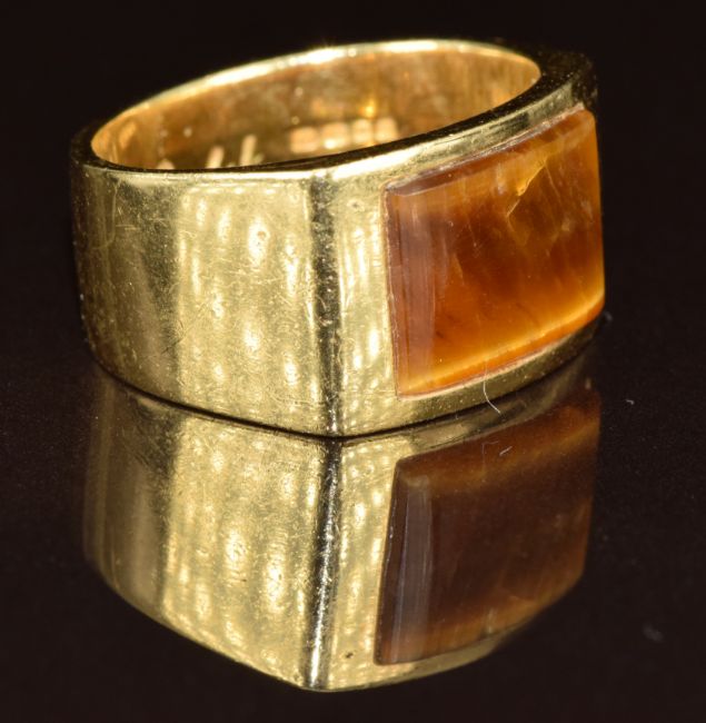 An 18ct gold signet ring set with tiger's eye, 13g, size N