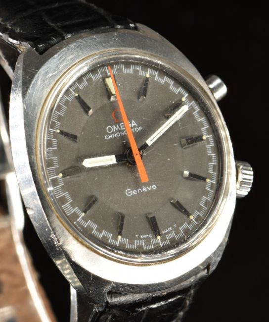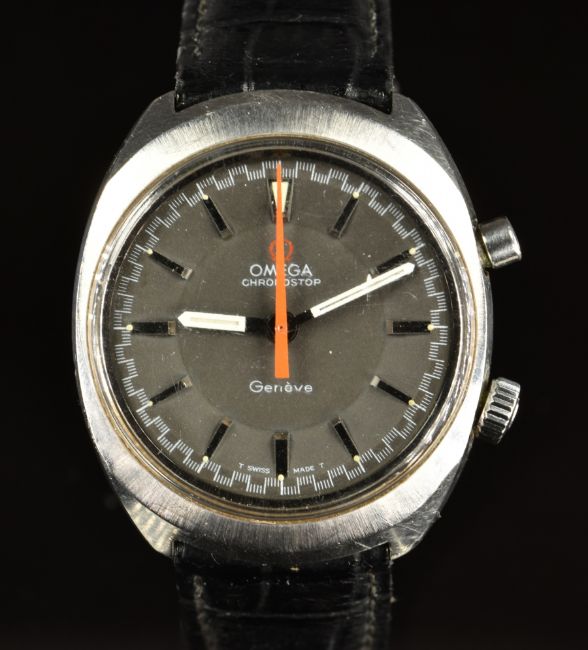 Omega Chronostop gentleman's chronograph wristwatch ref. 145.009/ 145010 with date aperture, grey racing dial, luminous white hour and minutes hands, orange centre seconds hand, silver baton hour markers, stainless steel case and signed 17 jewel calibre 885 movement, on black leather strap, case diameter 35mm, serial number 29611422.