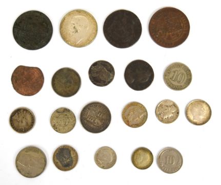 A small collection of English and overseas coinage to include 1733 George II farthing, 1790 Prince of Wales token and Bath token, some silver content