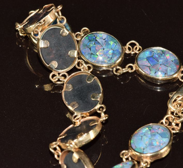 A 9ct gold bracelet set with opal mosaic panels, 11.2g, 18cm