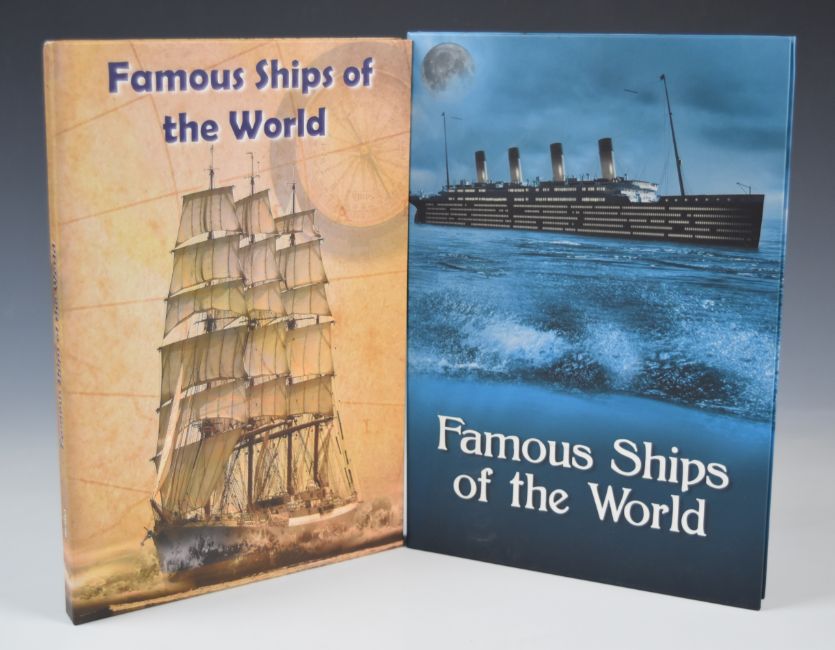 Famous Ships of the World coin set comprising two presentation folders, each containing one 0.5g .585 gold miniature coin and 24 33mm gold plated picture coins, with certificates