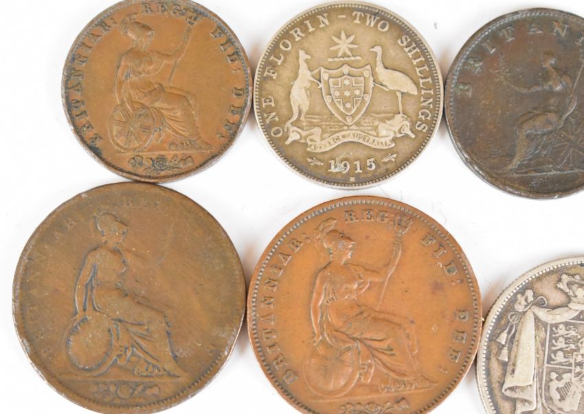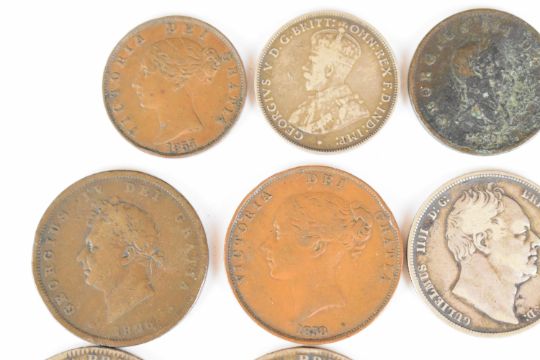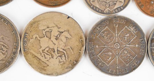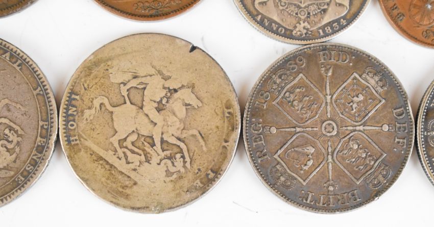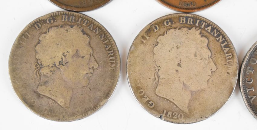 Georgian and later coinage to include two George III crowns, one dated 1820, 1887 and 1889 florins, 1826 and 1853 pennies and 1857 and 1858 half pennies, total weight of pre 1920 silver approximately 116g