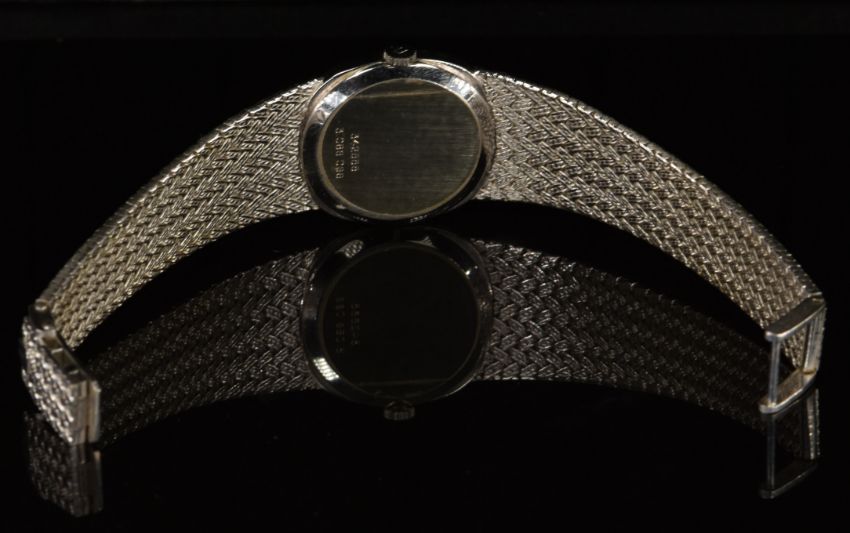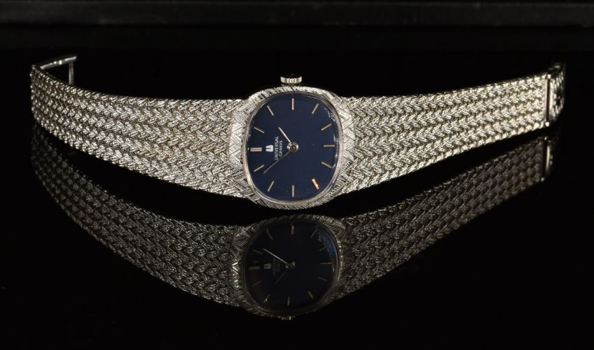 Universal Genève 18ct white gold ladies wristwatch with silver hands and hour markers, blue dial and signed 17 jewel movement, on integral 18ct white gold bracelet, case diameter 24mm, serial number 342555, 45g.