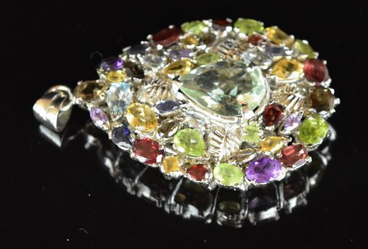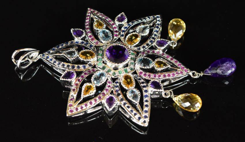 Three silver pendants set with amethysts, peridiot, garnets, topaz, citrine, rubies, sapphires and emeralds, 86g