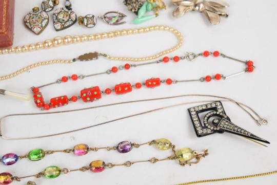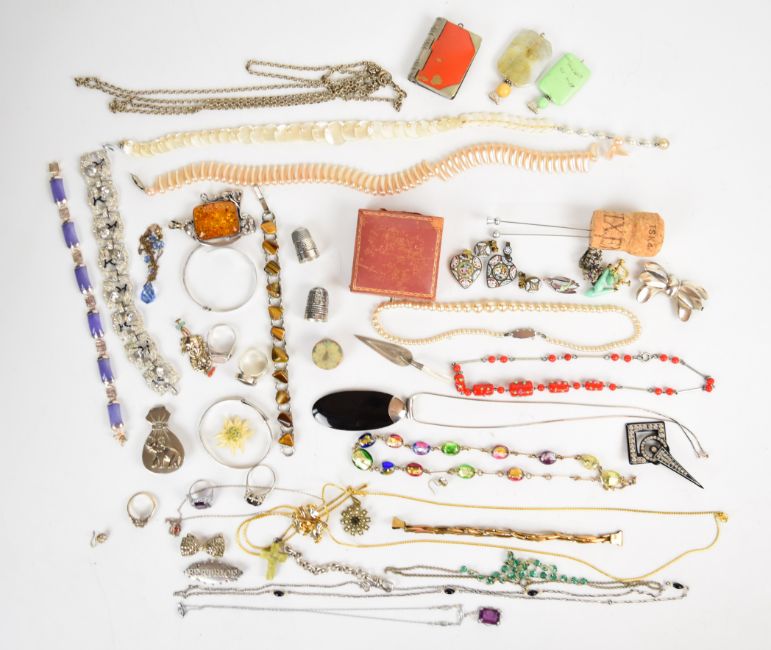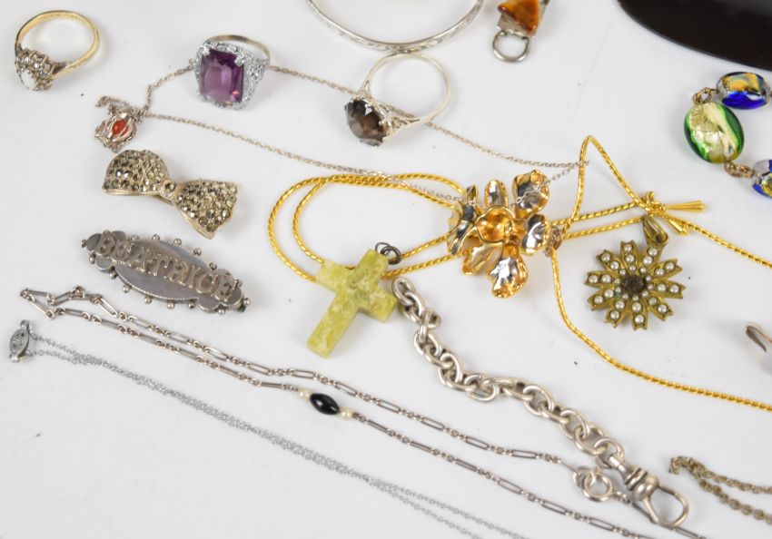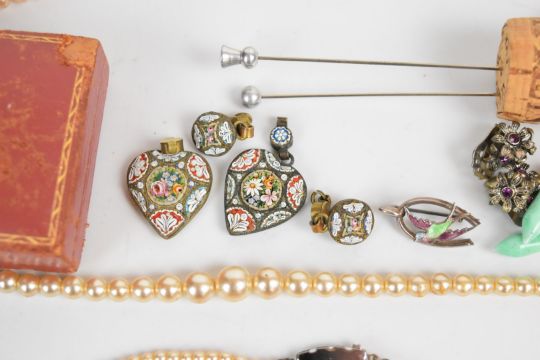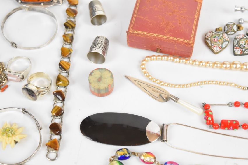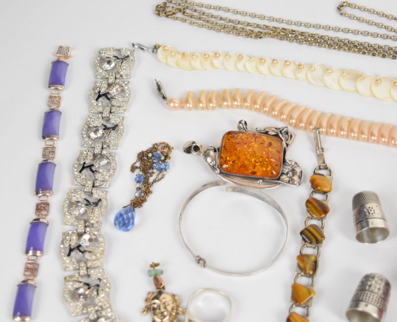 A collection of jewellery including Art Deco bracelet and brooch, micro mosaic pendants, paste earrings, book vesta, rolled gold guard chain, silver thimble by Charles Horner, silver christening bangle, four silver rings including one set with Blue John, silver pendant set with amber, etc