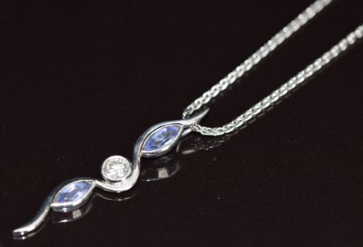 A platinum pendant set with two marquise cut tanzanites and a round cut diamond of approximately 0.2ct, 8.5g, the chain 46cm and pendant 3.5cm