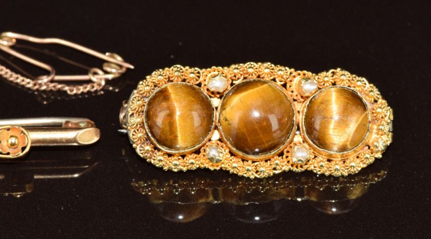 A 9ct gold brooch set with a diamond (2.5g, 3.8cm) and an 18ct gold brooch set with tiger's eye and pearls (4g, 3.1cm)