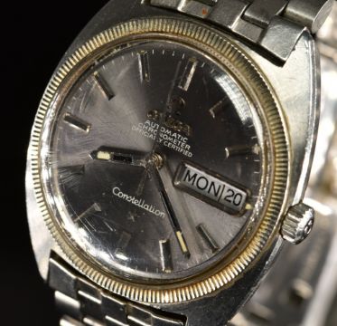 Omega Constellation chronometer gentleman's automatic wristwatch ref. 168.029 with day and date aperture, luminous steel hands, two-tone baton hour markers, slate grey dial and signed 24 jewel calibre 751 movement, on stainless steel bracelet, case diameter 35mm, serial number 30792516.