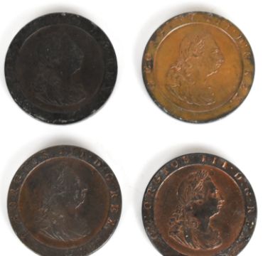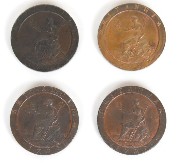 Four 1797 George III one penny coins, with original patination