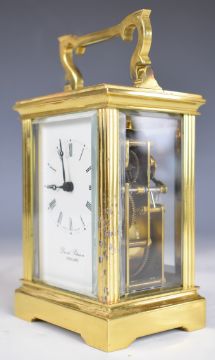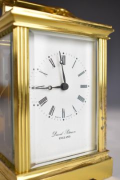David Peterson gilt metal cased carriage clock with white painted dial, striking on a bell, height including handle 15cm