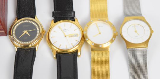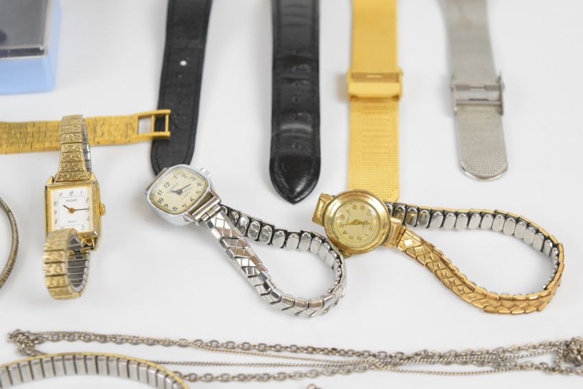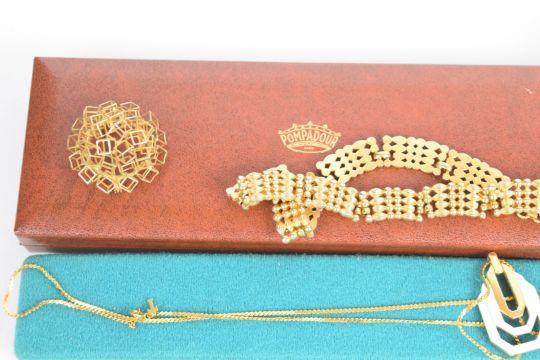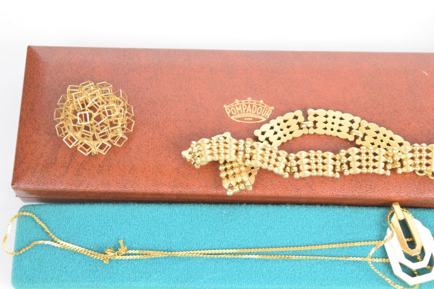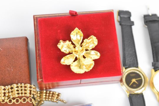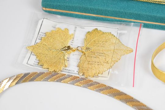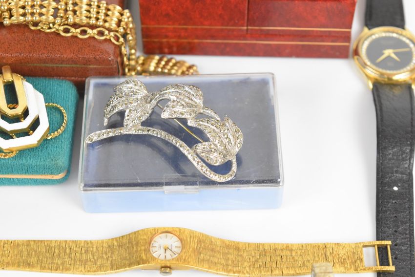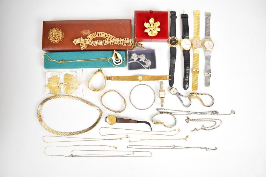 A collection of jewellery including Monet necklace, Trifari necklace, watches gold plated leaf pendant, etc