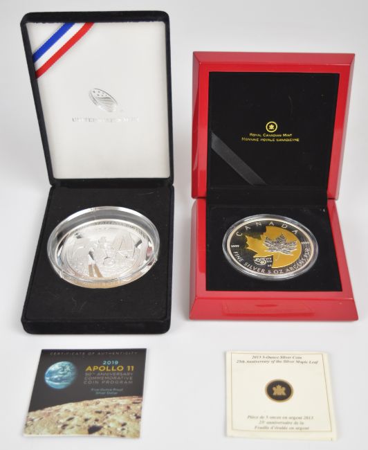 Two 5 oz silver coins comprising United States Mint 2109 Apollo 11 and Royal Canadian Mint 25th Anniversary of the silver Maple Leaf