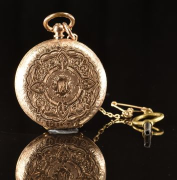 Unnamed 14ct gold open faced pocket watch with gold hands, blue Roman numerals, gilt decorated white enamel dial and unsigned movement, case diameter 34mm, serial number 69887, 27g.