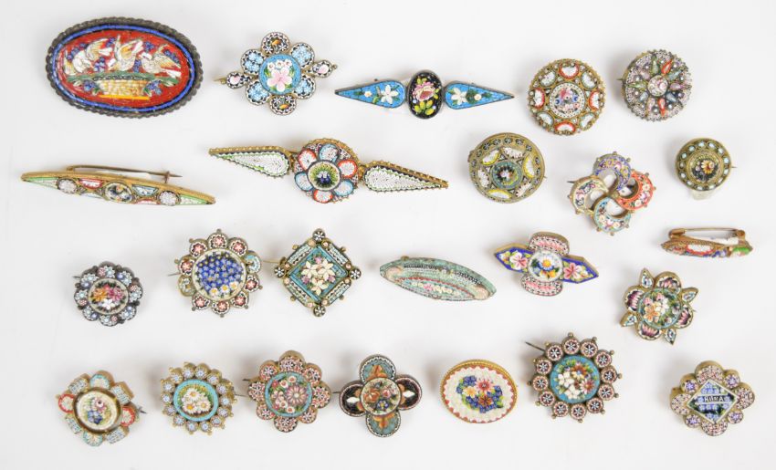 Twenty-three c1900 micro mosaic brooches including one in the form of a shoe and one 'Roma'
