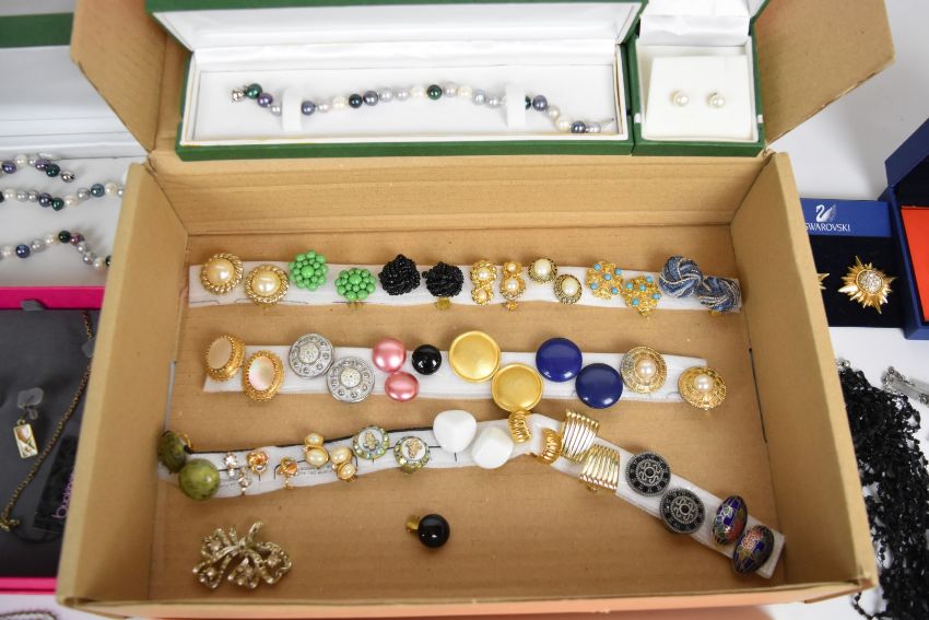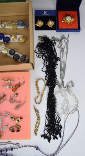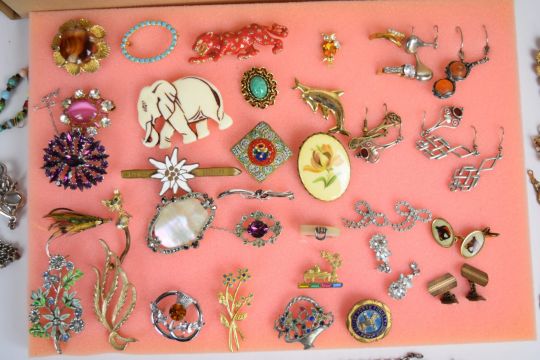 A collection of jewellery including silver chain, silver earrings, micro mosaic and vintage brooches, vintage earrings, Florenza earrings, Art Deco beads, pearl bracelet and necklace, Swarovski earrings and brooch, etc