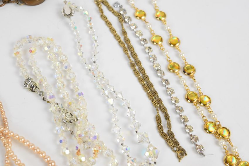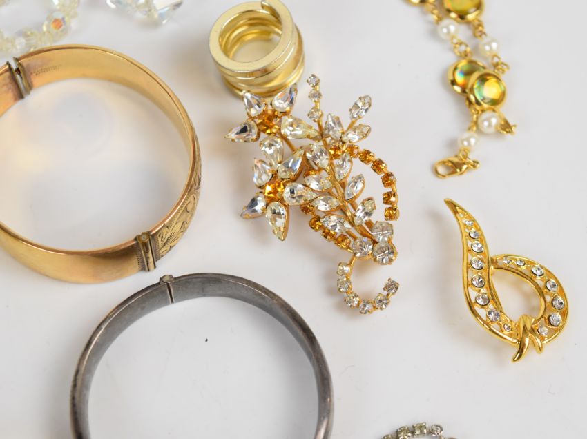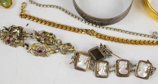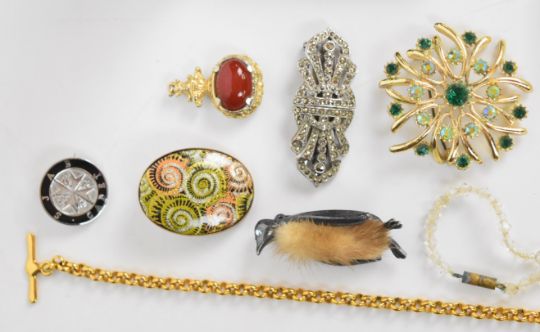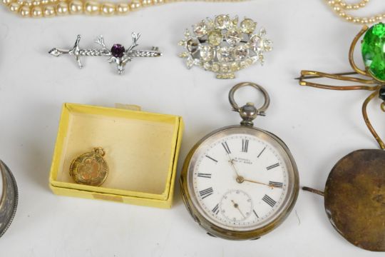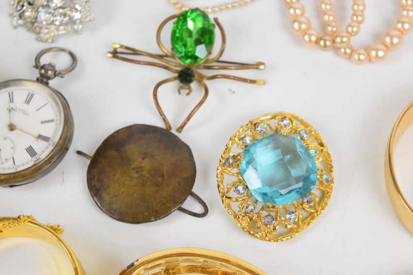A collection of jewellery including vintage spider brooch, diamanté necklace, Coro bracelet, vintage brooches, two silver bangles, carved jet brooch, silver pocket watch, silver swivel fob, necklace, etc