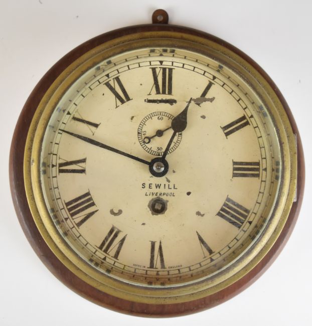 Sewill Liverpool ship's bulkhead clock in brass case mounted on a wooden board, diameter of clock 23cm
