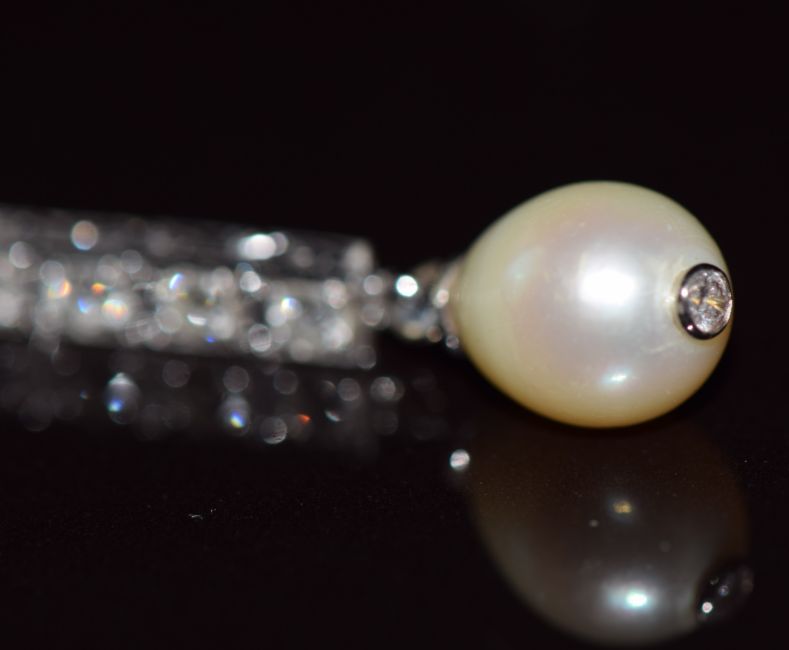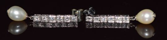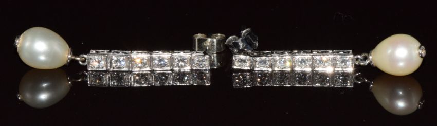 A pair of platinum drop earrings each set with six round brilliant cut diamonds of approximately 0.08ct and a diamond set natural saltwater pearl, each pearl approximately 7.6 x 9.6mm, 6.4g, with Gem & Pearl Lab report