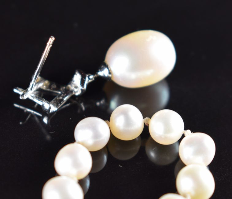 A pair of 18ct white gold earrings set with a freshwater pearl and diamonds (4.3g) and a pearl bracelet with 9ct gold clasp
