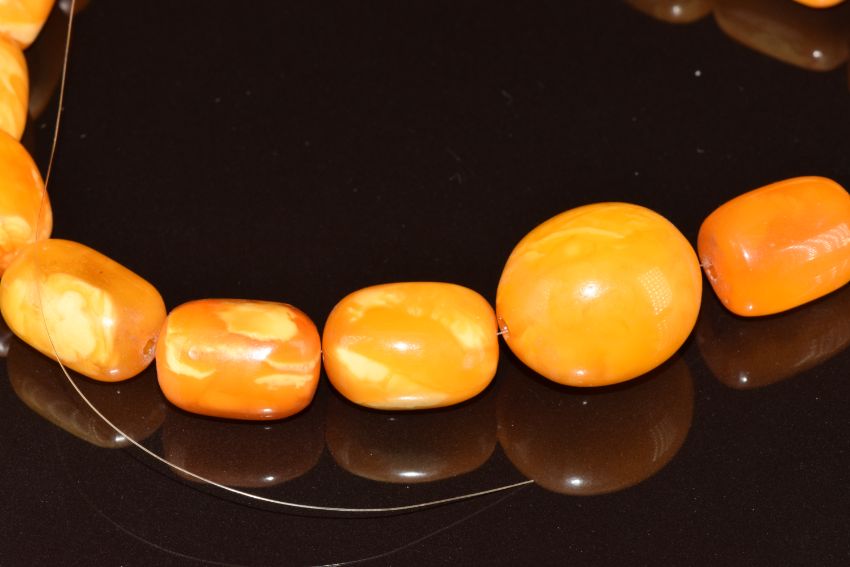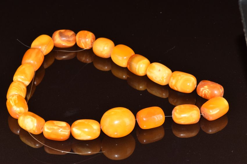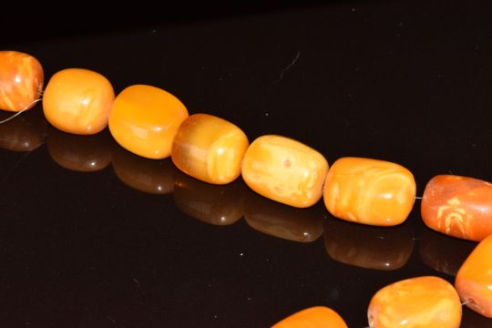 A Baltic amber necklace made up of 20 barrel shaped beads, 39.1g, 32cm