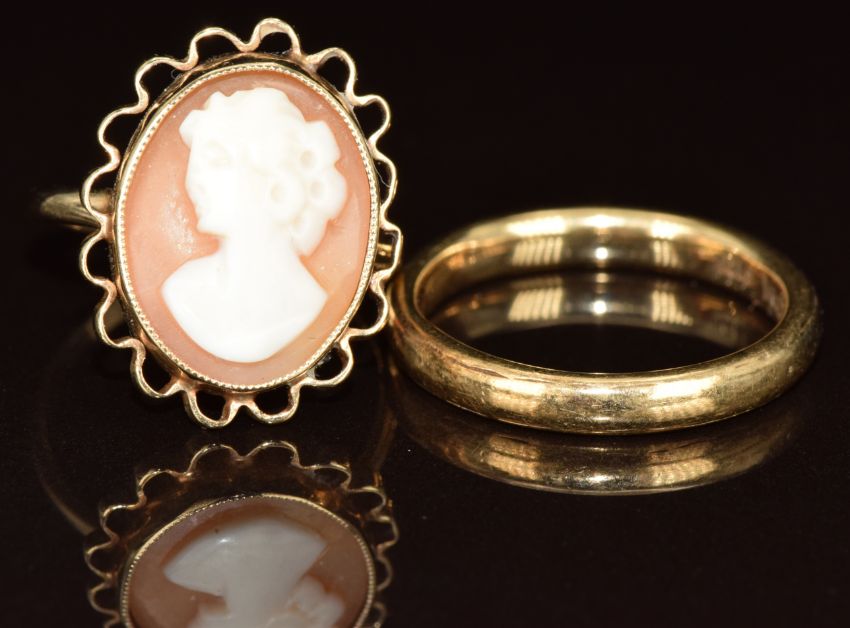 A 9ct gold wedding band and a 9ct gold ring set with a cameo, 6.7g, sizes O & M