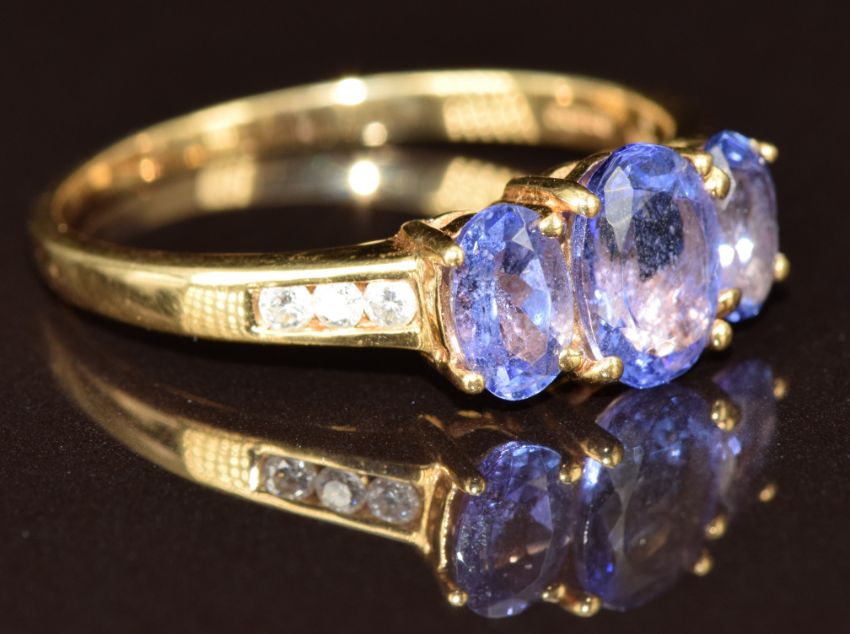 An 18ct gold ring set with three oval cut tanzanites totalling 2ct and diamonds, 4g, size T