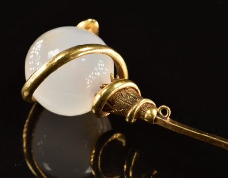 Victorian stick pin in the form of a serpent set with rose cut diamond eyes wrapped around a chalcedony bead, 10cm
