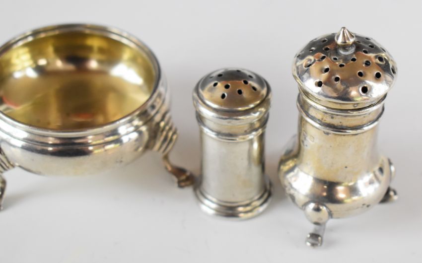 Hallmarked silver condiments comprising sugar sifter, two peppers and three open salts including a pair raised on ball feet, height of tallest 14cm, weight of all items 196g