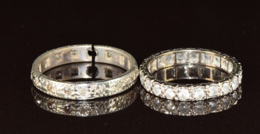 An 18ct white gold eternity ring set with diamonds (damaged, 2.3g) and a 15ct gold eternity ring (2.5g)
