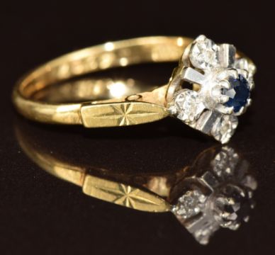 An 18ct gold ring set with a sapphire and diamonds, 2.4g, size L
