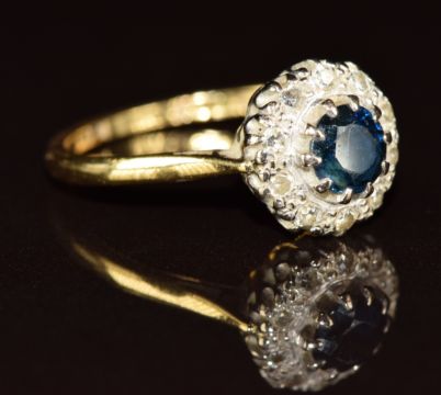 An 18ct gold ring set with a sapphire surrounded by diamonds, 3.1g, size M