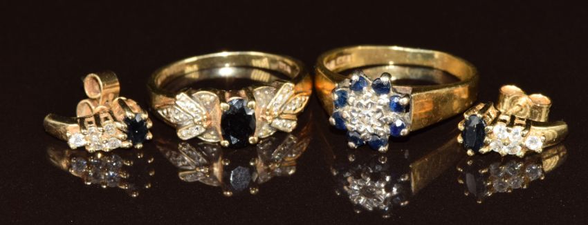 An 18ct gold ring set with a diamond surrounded by sapphires (4.1g, size J), a 9ct gold ring set with a sapphire and diamonds (2.4g, K) and a pair of 9ct gold earrings set with a sapphire and cubic zirconia (1.9g)