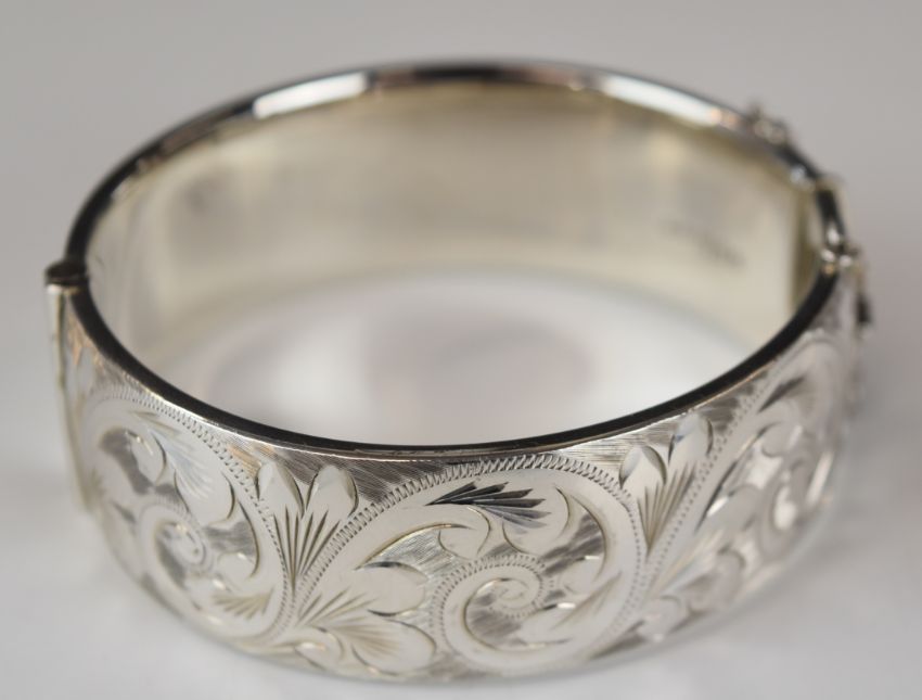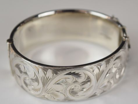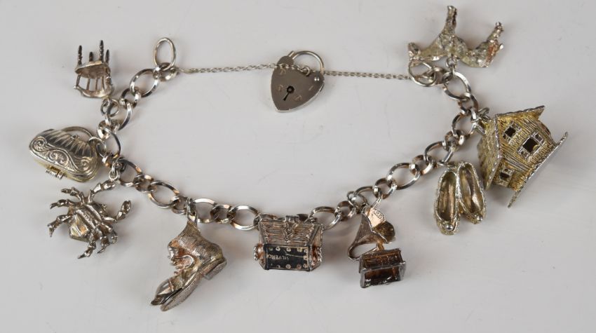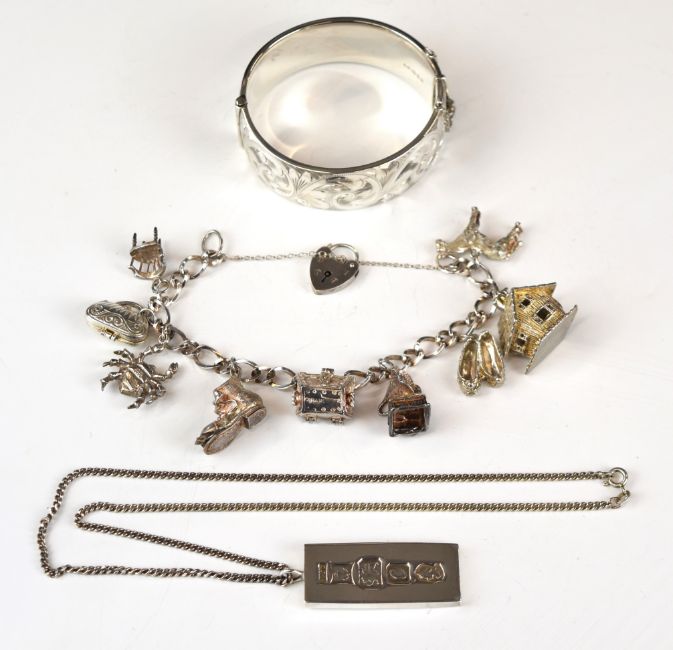 A silver charm bracelet with nine charms including treasure chest, horse, crab, etc, a silver bangle and silver ingot pendant, 158g