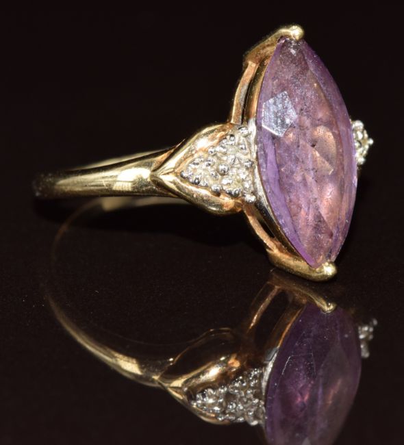 A 9ct gold ring set with a marquise cut amethyst and diamonds, 2.7g, size N