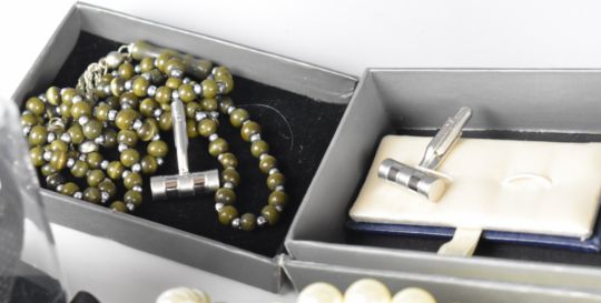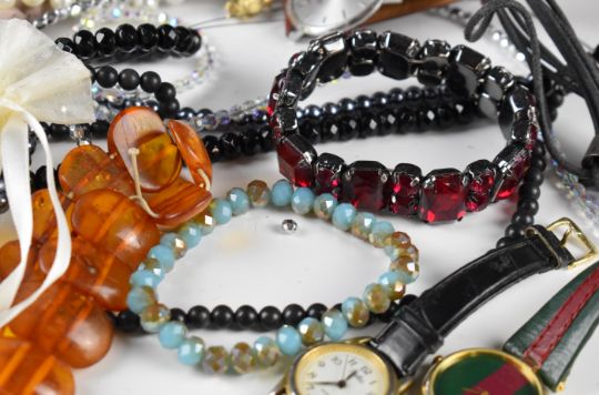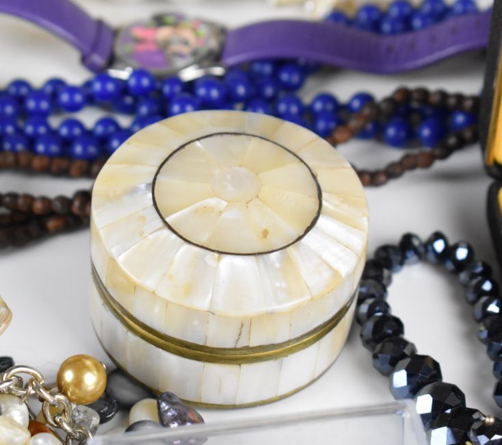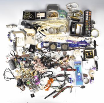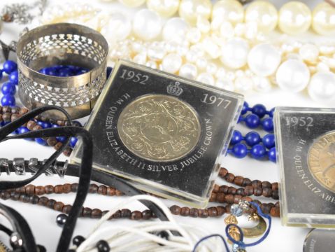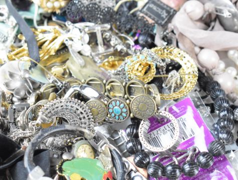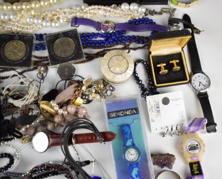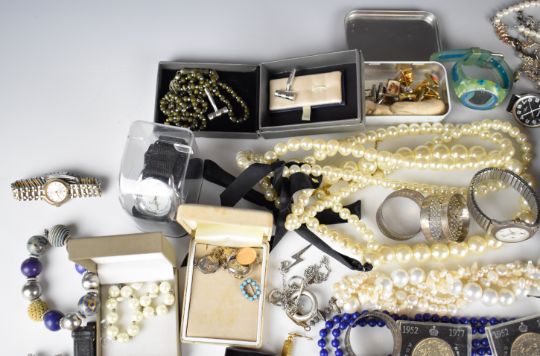A collection of jewellery including 9ct gold St Christopher and chain (3g), 9ct gold ring mount (1.3g) brooches including Sarah Coventry and vintage, silver brooch and earrings set with marcasite, further silver including chain, charm bracelet, two lockets, etc