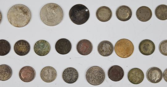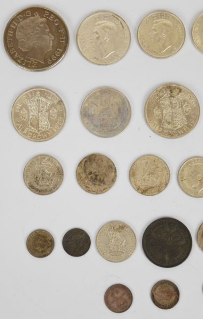 Approximately 189g of pre 1947 English silver coinage together with a Queen Victoria Gothic florin, 1780 Russian 5 kopek coin, Roman coin, two Princess Diana memorial £5 crowns etc