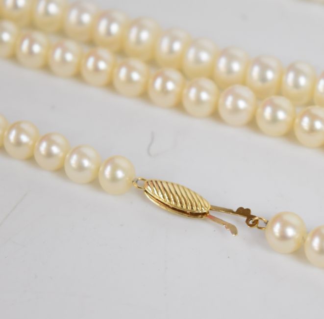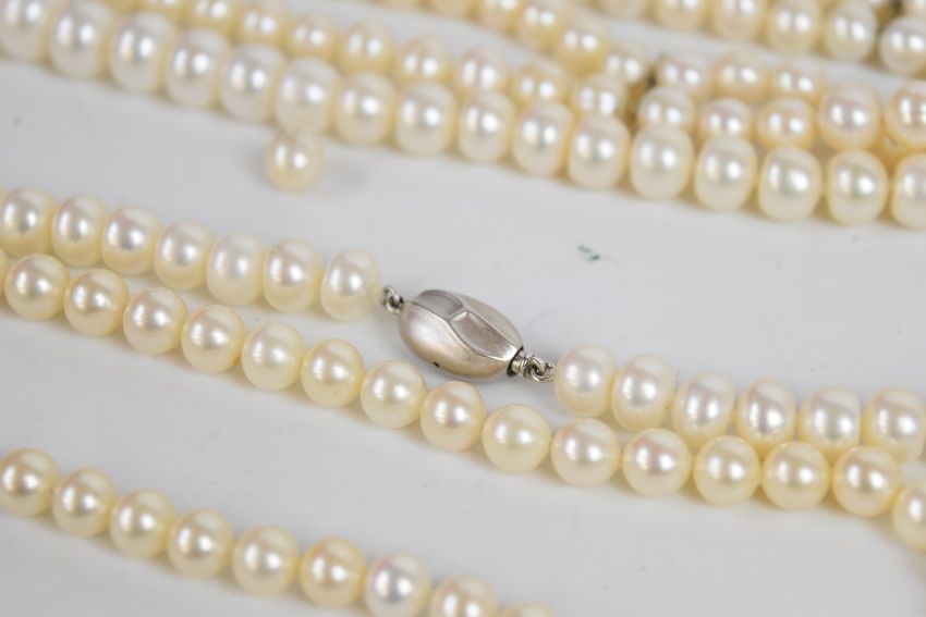 A single strand of cultured pearls with 14k gold clasp, three strand cultured pearl necklace with 14k gold clasp and a single strand of freshwater pearls with silver clasp