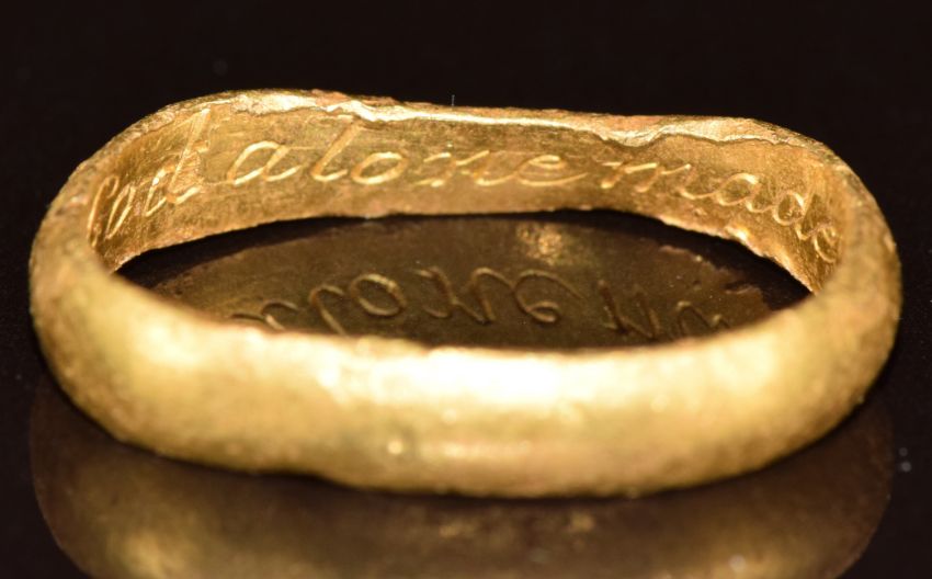Antique yellow metal posy ring engraved to the inner band 'God alone made us troo one', stamped with makers mark, 5.4g (damaged)
