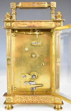 Brass cased carriage clock with bevelled glass and silvered and gilt dial, height including handle 15cm