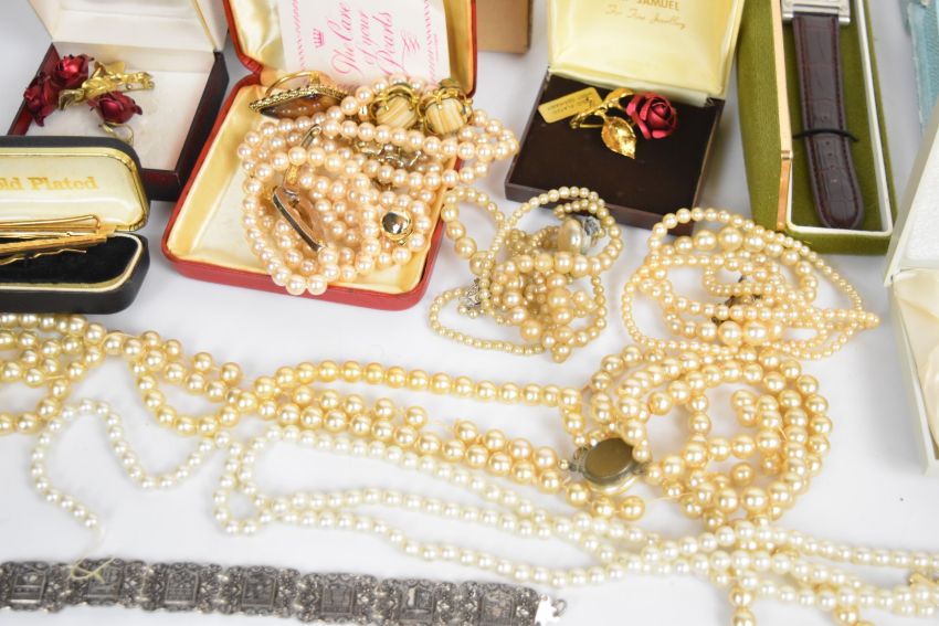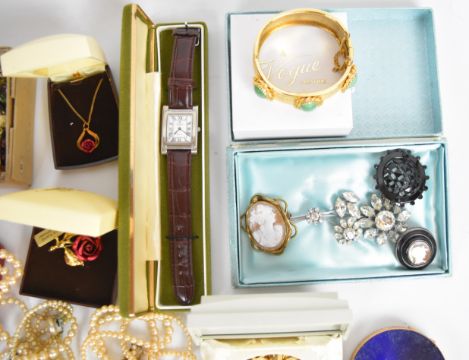 A collection of jewellery including Art Deco lorgnette, vintage brooches, silver brooch set with a cameo surrounded by jet, Victorian cameo, French jet brooch, vintage bangle, gold plated tie pins, Empire bracelet, faux pearls, silver chains, Siam silver brooch, etc